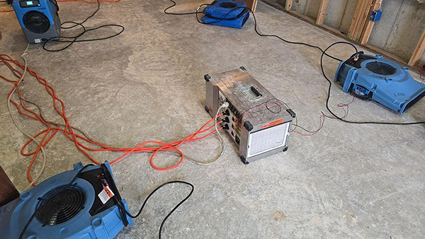 With the damaged materials removed and the structure exposed, the restoration team installed specialized drying equipment throughout the basement. High-velocity air movers were positioned to circulate air across wet surfaces, helping moisture evaporate from the structure.