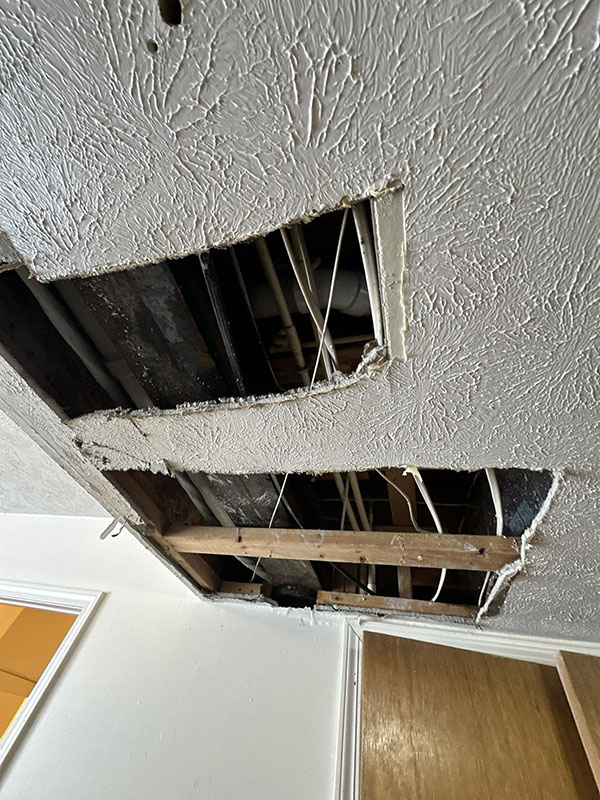 Small ventilation holes were drilled across the ceiling surface to release moisture and promote airflow during the drying process. In some areas, larger sections of drywall were removed to access the plumbing and allow the structure to dry properly.