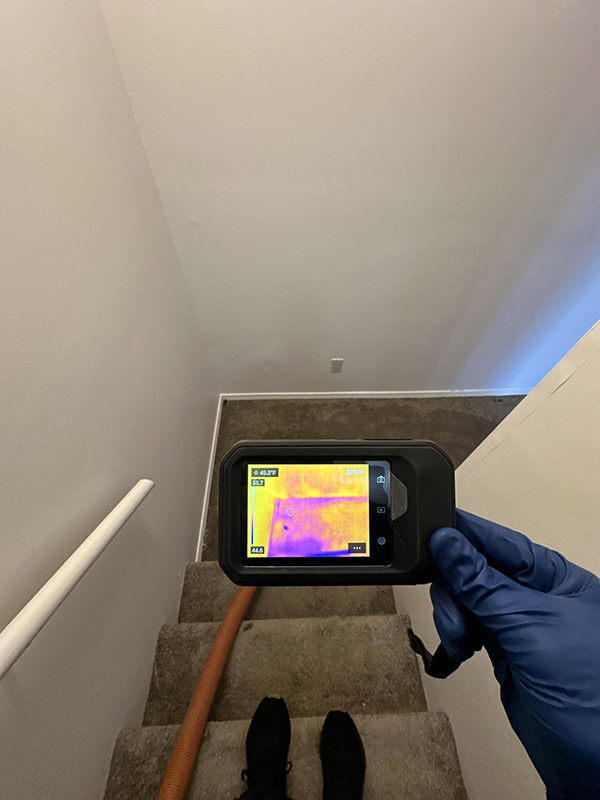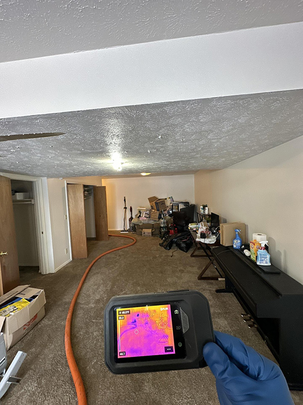 Water damage often spreads far beyond what is visible on the surface. To detect hidden moisture inside walls, ceilings, and flooring, the restoration team used thermal imaging technology. These cameras highlight temperature differences that reveal areas where moisture may be trapped behind materials.
