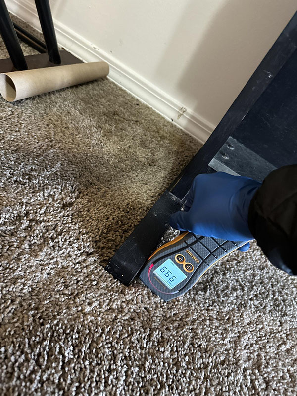 The readings confirmed that the carpet and padding had absorbed a significant amount of moisture. In situations like this, the padding beneath the carpet is usually removed because it retains water and can quickly develop mold or odors if left untreated.