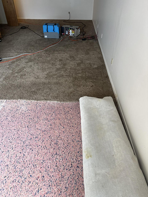 Once the moisture levels were assessed, the restoration team began removing materials that could not be effectively dried. Water-damaged carpet padding was carefully lifted, and in some areas the carpet itself was rolled back to expose the subfloor beneath. Carpet padding is highly absorbent and tends to retain moisture for long periods, making it difficult to fully dry once saturated. By removing these materials, technicians were able to access the underlying structure and ensure that trapped moisture would not remain hidden beneath the flooring.