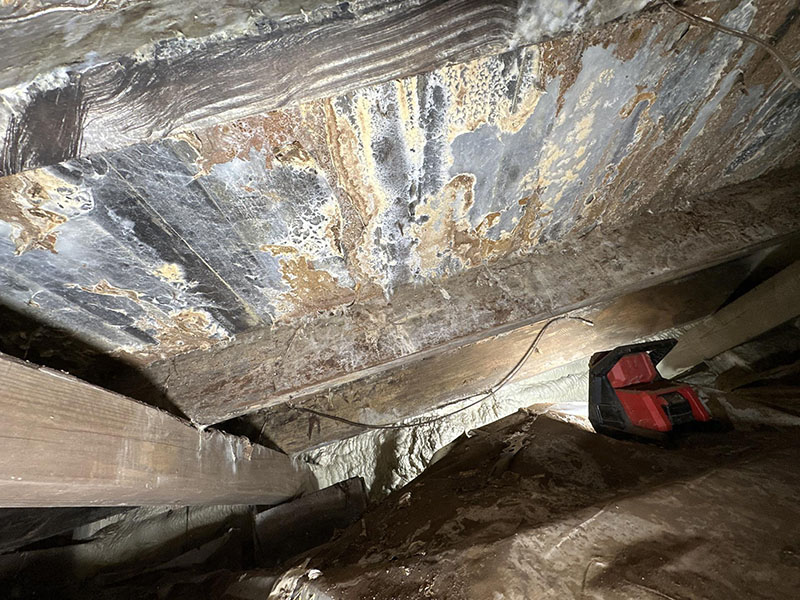 Inside the crawlspace, we found significant mold growth covering the wooden joists and subflooring. The mold had spread across large areas, thriving in the damp, stagnant air where moisture had gone unchecked for months, possibly even years. This type of contamination is a clear indicator of prolonged moisture exposure, often caused by poor ventilation, minor plumbing leaks, or groundwater seepage. Left unaddressed, mold like this can compromise structural integrity and pose serious health risks to occupants. It’s a reminder of why preventative maintenance is so important, not just in homes, but also in commercial properties where water damage can lead to similar challenges.
